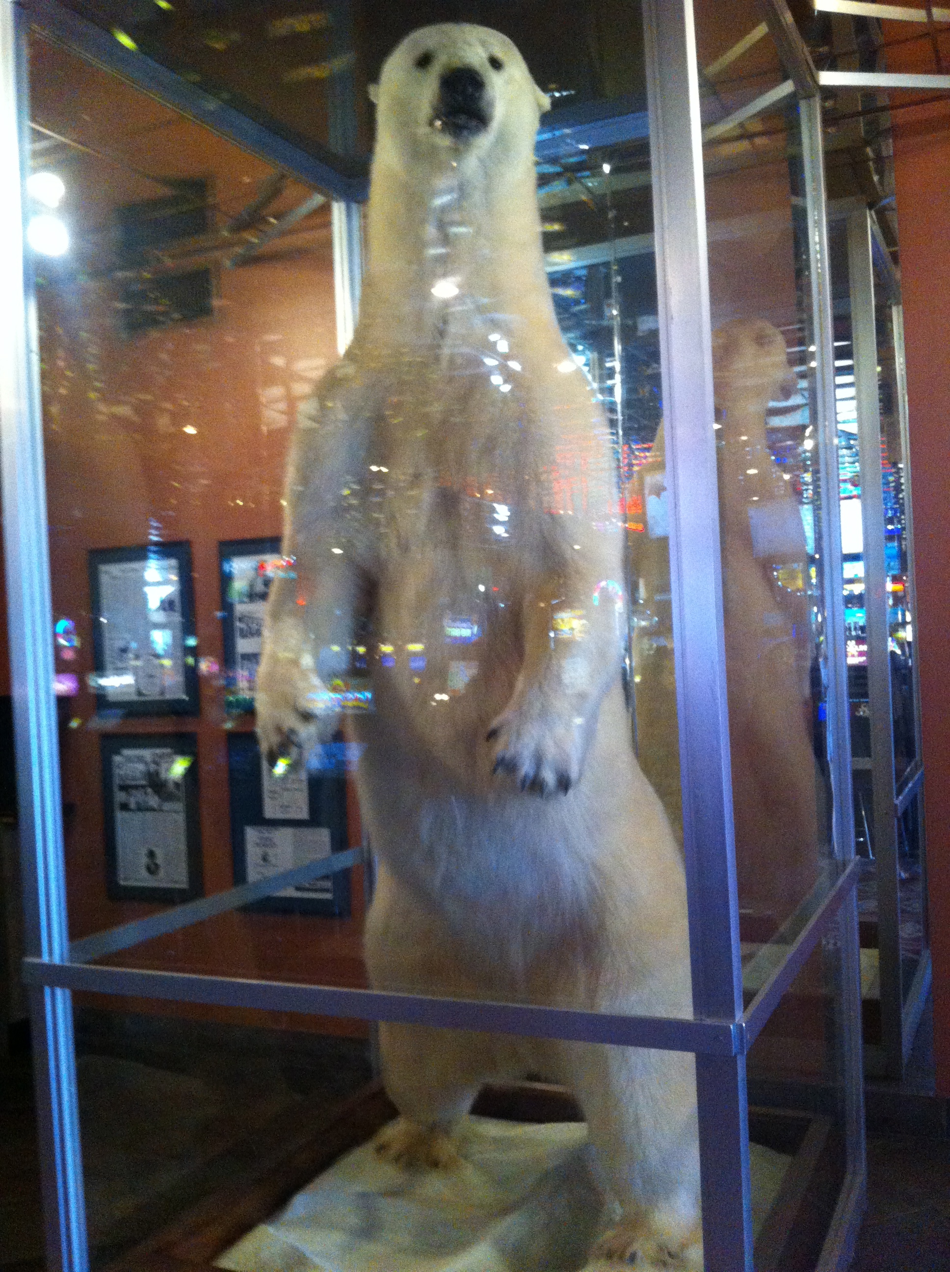 Two thousand pounds of muscle, fur and claw, 10 foot 4 inches tall, he should have commanded the attention of the few afternoon gamblers, but they were worried about other things, like their smoldering cigarettes and the coins going into the slot machines. Anyway, White King was killed by an Eskimo back in the 50’s. WELL worth the pit stop.